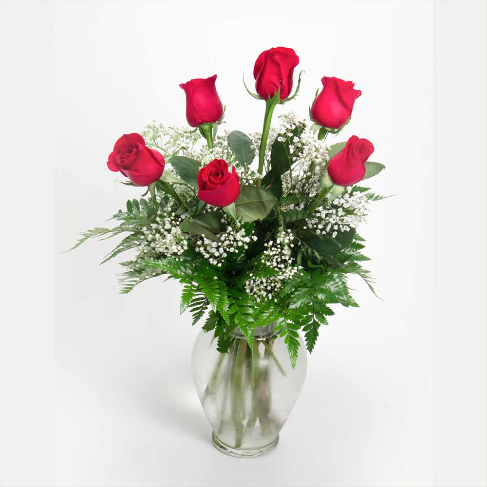 6 long-stemmed red roses, designed with greenery and baby's breath arranged in a clear vase