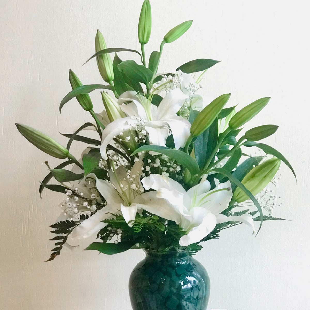 This beautiful arrangement is designed with white Siberian fragrant lilies. Trumpet size blooms, with 3-5 large bell shaped blooms perfect for any occasion.