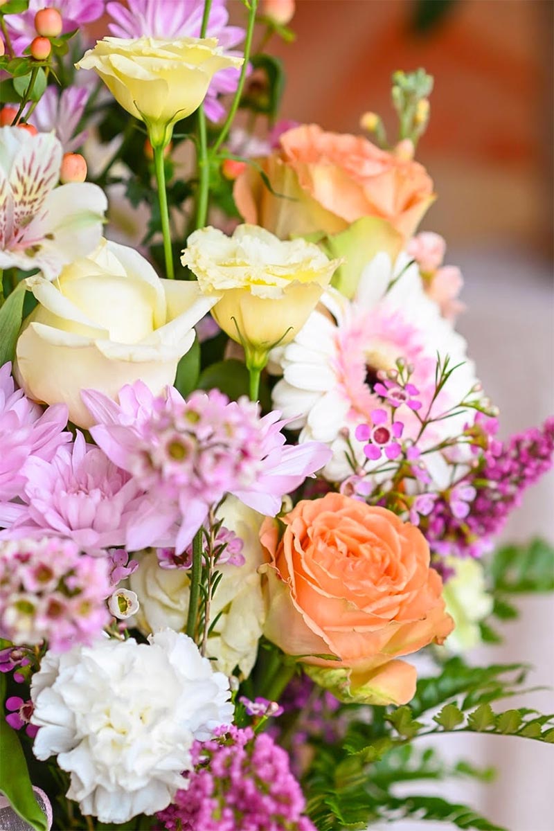 This custom designed bouquet, will put a smile on that special person’s face. It will give them a feeling of fullness and joy. These radiant and beautiful peach and light pink roses, wax flowers, daisy pomps, daisies, lianthus, carnations, alstroemerias, Heather, hypericum, beautiful peach stock, and a touch of greenery.
