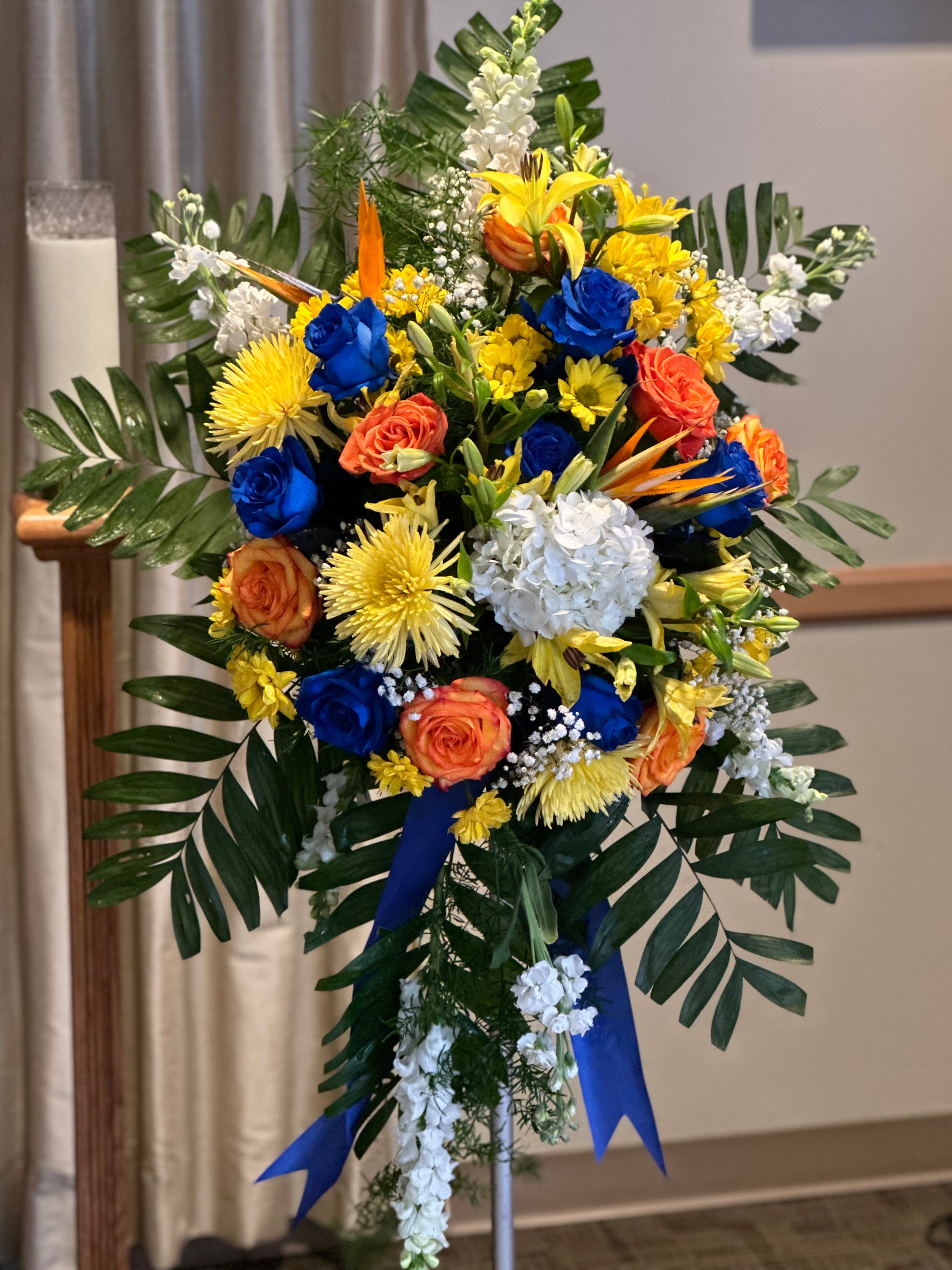This beautiful spray of yellow lilies, yellow brighton roses, bi-color orange roses, blue rose (optional), yellow gladiolas, white and yellow snapdragon, dark blue delphiniums, with designer’s greenery celebrates a bright life of beauty and love.