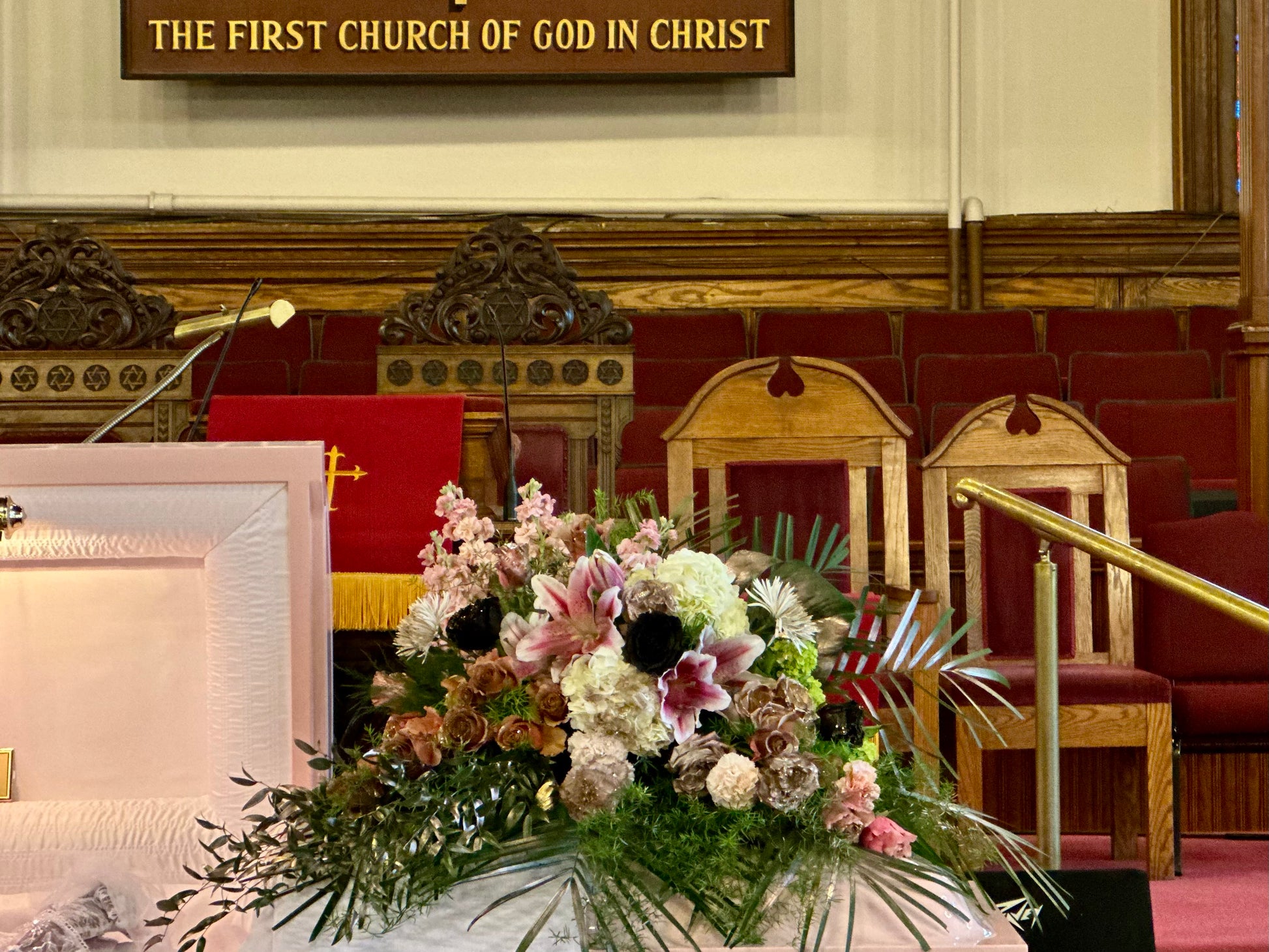 This warm and earthy design boasts vintage moab garden roses, sparkles with a touch of rose gold, stargazer lilies, pink stocks, a dap of three black roses, soft mauve and pink carnations with designer’s greenery. A majestic spray will exude love and appreciation for memories shared.