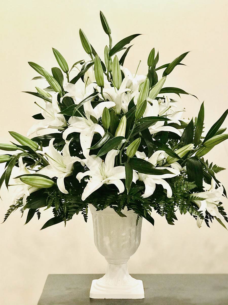 This beautiful breath taken masterpiece, designed with large Siberian lilies blooms, mixed in with designer's fresh greenery.