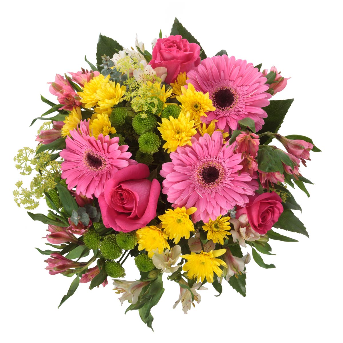 This soft but vibrant arrangement is perfect to express your love. This arrangement is designed with bright pink roses,pink gerbera daisies, green buttons, bright and cheeful yellow daisies, alstromeries, and selected designer greenery.