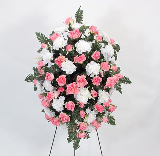 Remembering your loved one with this beautiful casket spray designed with powered white fluffy carnations and baby pink roses, arranged with leather leaves and luscious greenery.