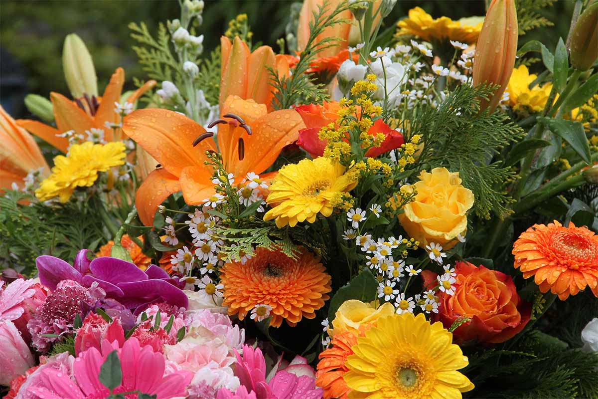Send your get well wishes. This gorgeous and colorful bouquet is beautified with bold orange lilies, roses, daisies, pink and yellow gerbera daisies, yellow and orange lilies, white aster, solidago, with rain forest greenery. Available in a selected vase.