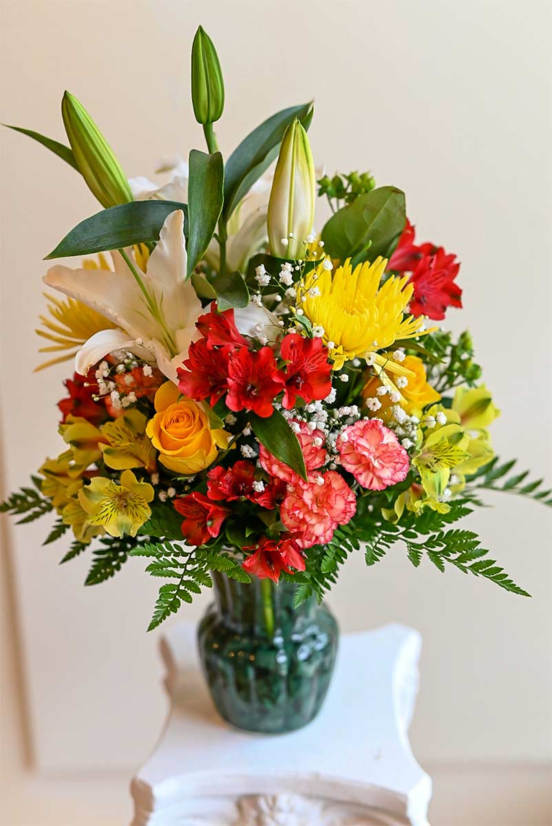 This breath taking arrangement was designed for that special loved one. These vibrant colors included Fuji mums, miniature novelties carnations, large Siberian white lilies, multiple alstroemerias, yellow and peach roses, green hypericum, fluffy snow white new baby’s breath and farm fresh greenery.