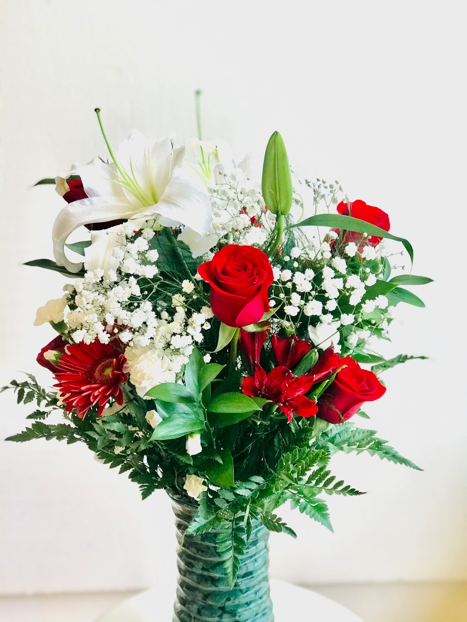 Perfect for that special birthday celebration. Arranged with these fragrantly Siberian large showy, blooms lilies. A fragrant that smells so peaceful, red roses, Gerbera daisies, alstroemerias, Israeli ruscus, leather leaves and a touch of baby’s breath.